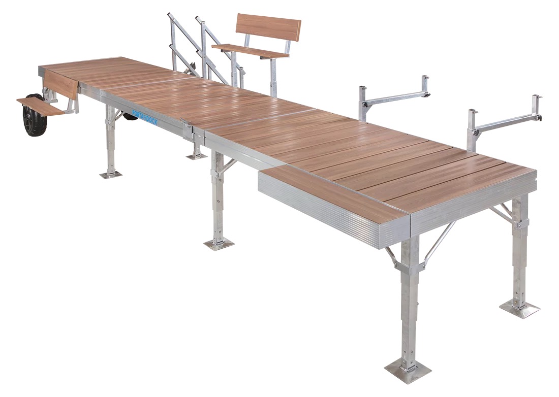 Made entirely of aluminum, available in White, Beige, or WoodGrain and completely customizable to your shoreline. Add on optional platforms and hand railings for extra stability.
